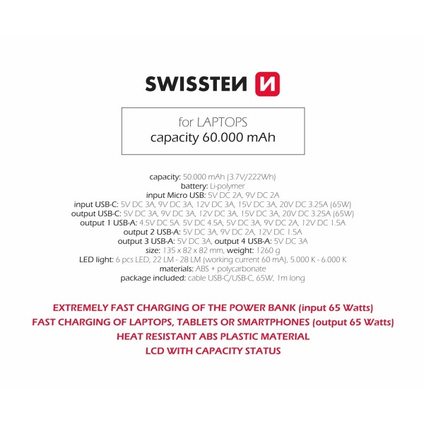 je ideálnou voľbou pre tých, ktorí potrebujú spoľahlivý a výkonný zdroj energie pre svoje zariadenia. Táto powerbanka sa vyznačuje vysokou kapacitou a rýchlym nabíjaním, vďaka čomu môžete nabíjať svoje notebooky, tablety, smartfóny a ďalšie zariadenia kedykoľvek a kdekoľvek. Pre väčšiu bezpečnosť je vyrobená z nehorľavého materiálu ABS + PC, ktorý zaručuje odolnosť a bezpečnosť pri používaní. Powerbanka je zabalená v elegantnej škatuľke SWISSTEN, vďaka čomu je aj skvelým darčekom.
