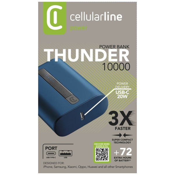 Pre rýchle nabíjanie sú k dispozícii dva porty. Port USB-C Power Delivery s výkonom 20 W nabije iPhone 12 a vyššie maximálnou rýchlosťou, zatiaľ čo port USB s adaptívnym rýchlym nabíjaním nabije najnovšie telefóny Samsung, Huawei a ďalšie telefóny výkonom 18 W. Mäkký pogumovaný povrch powerbanky je príjemný na dotyk a má protišmykové vlastnosti. Powerbanka Cellularline Thunder je dokonalým doplnkom na dovolenku aj na každodenný život.