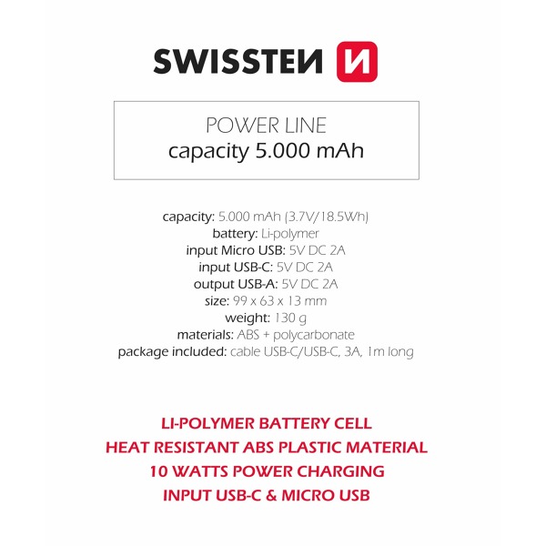 Či už ste na dovolenke, služobnej ceste alebo len cestujete po meste, powerbanka SWISSTEN vám poskytne spoľahlivý zdroj energie, ktorý potrebujete. Jej kompaktné rozmery a ľahká konštrukcia z nej robia dokonalého spoločníka, vďaka ktorému budú vaše zariadenia vždy nabité a pripravené na použitie.