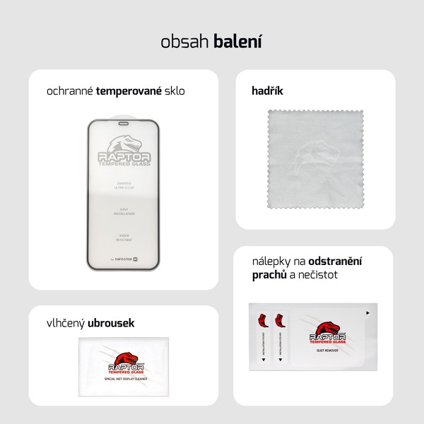 Snadné lepenie s vrstvou ESD ESD (Electrostatic discharge) je najlepší plne priľnavý povlak, ktorý nepriláka prach z okolia. Povlak uľahčuje a urýchľuje proces inštalácie a tiež znižuje pravdepodobnosť výskytu prachu a iných drobných prvkov medzi sklom a displejom. Súčasťou balenia skla Swissten Raptor je aj sada pre jednoduchú aplikáciu skla na smartfón. Vlhký handrička na odmastenie a zbavenie nečistôt z displeja smartfónu spolu so suchým handričkou dokonale displej vyčistí a pripraví na jednoduché nalepenie. A samolepky pre odstránenie prachových častíc v prípade, že by sa dostali pod lepené sklo. Vďaka lepiacej vrstve ESD skla Swissten Raptor a čistiacej sade sa darí sklo nalepiť krásne bez bublín. Silikónová lepiaca vrstva navyše zníži viditeľnosť prípadných škrabancov na použitom smartfóne a pretože je nanesená po celej ploche skla, zachová citlivosť ovládania smartfónu.